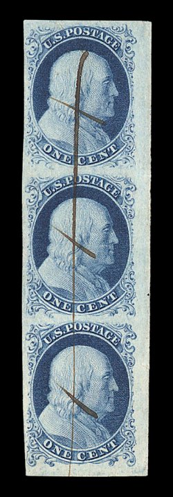 46 O image#6, 8A, 8, 1c Blue, Ty. Ia/Ty. IIIa/Ty. III vertical combination strip of three, positions 80/90/100L4, a spectacular bottom right corner sheet-margin vertical strip of three, with the bottom stamp being the very rare Ty. Ia, while the center stamp is Ty. IIIa and the top stamp is Ty. III, in a most remarkable state of preservation and overall condition, boasting lavishly large to huge margins all around, plus its color is extraordinarily deep and its impression truly prooflike on incredibly fresh paper, completely free of any flaws one might expect to find on such a strip, neat manuscript cancels, extremely fine in every regard; illustrated on page 115 of Lester G. Brookman's masterwork, The United States Postage Stamps of the 19th Century, and described by him as "remarkable", a description with which we cannot disagree; to our knowledge this is the only recorded combination strip containing this exact trio of types in a single strip, therefore it is unlisted in the Scott catalog; an immensely rare and desirable multiple essential to the serious collector, exhibitor or student of the One Cent Blue imperforates; 1983 PF certificate; ex-Neinken. (Image) Est. 10,000-15,000