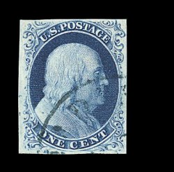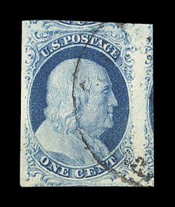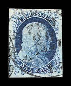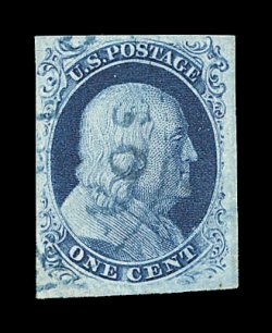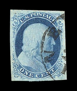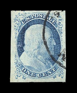 51 O image#8, 1c Blue, Ty. III, an exceptional quality used example of this rare and highly desirable stamp, being incredibly well margined for any One Cent Blue imperforate, but especially so on such an elusive type, with extra-large to huge margins all around, rich luxuriant color in a deep shade, plus its impression is especially strong which clearly shows a very large break in the bottom label, and clearly defined breaks at top, all wonderfully complemented by neat strikes of a blue town c.d.s., extremely fine gem; signed by Stanley B. Ashbrook and accompanied by 1957 and 1995 PF certificates; ex-Engel. (Image) 3,310.00