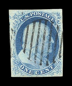 50 O image#7, 1c Blue, Ty. II, large perfectly symmetrical margins all around, bright color and impression, neat crisp strike of a circular grid cancel, extremely fine; 2000 PF certificate. (Image) 160.00