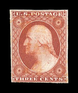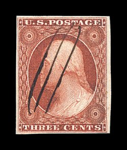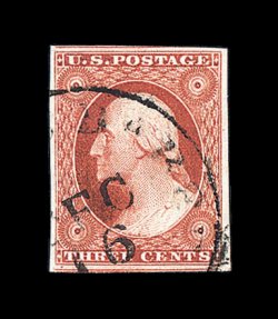60 O image#10 var., 3c Red orange brown, select used example that possesses the most intense color imaginable, being in a striking red orange brown shade (as specifically described on the accompanying certificate), excellent clarity of impression, large to extra-large margins all around, neat three stroke manuscript cancel, extremely fine; 2001 PSE certificate. (Image) 50.00