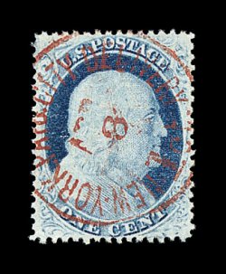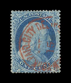 81 O image#18, 1c Blue, Ty. I, flawlessly centered amid uncharacteristically large margins, beautifully mottled impression typical of the Plate 12 printing, well struck and vivid red New York Carrier c.d.s., extremely fine gem; an extraordinarily choice example of this scarce and difficult stamp; 1999 PF certificate. (Image) 685.00