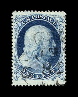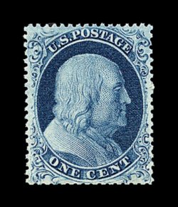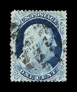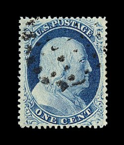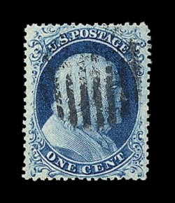 82 O image#19, 1c Blue, Ty. Ia, position 92L4, wide spaced perforations at both top and bottom, and unusually wide margins at sides, absolutely perfectly centered amid these breathtaking margins, sumptuously rich color and a prooflike impression on brilliantly fresh paper, lightly cancelled by a Boston c.d.s., superb. This remarkable gem is the finest recorded single of the rare Type Ia perforated stamp and it is among the very few that exist with the wide spaced perforations. Widely regarded as one of the most famous of all condition rarities in United States philately, this stamp is one of the highlights of the Hinrichs collection. The rarity of any Type Ia stamp (imperforate or perforated) is explained by the fact that they were produced from only 18 of the 20 bottom row positions on the 200-subject sheet. Perforated stamps from Plate 4 are even more challenging given the fact that they are invariably found with poor centering and tightness of margins due to the narrow spaces between the stamps as laid out on the original plates for the imperforate issue. To find one with choice centering, if even with its perforations cutting the design, is quite an accomplishment. However, there exists, for reasons yet to be fully explained by students of the issue, a small number of stamps that were produced where the perforating pins were possibly reset to create more room on the bottom row of the sheet. Examples with these wide spaced perforations are highly prized by collectors as they allow for the entire design to show without being impinged by perforations. Only a small number of such copies exist, and fewer still are found completely sound. None, however, come close to the spectacular quality of the copy offered here. The Scott catalogue notes, as a footnote to its basic listing for the perforated Type Ia, "Copies of this stamp exist with perforations not touching the design at any point. Such copies command very high prices." This statement is confirmed by the fact that each time this incomparable copy has been sold, either at auction or by private treaty, it has always commanded a price in excess of ten times of its then current catalog value. It's last appearance at auction was in the October 1998 sale of the Robert Zoellner collection (Robert A. Siegel Auction Galleries, Inc.), where Dr. Hinrichs acquired it, after fierce bidding competition, for $50,000.00, plus the 10% buyer's premium, versus its then current catalog value of $4,000.00. ex-Eno, Zoellner. (Image) 6,750.00