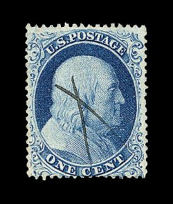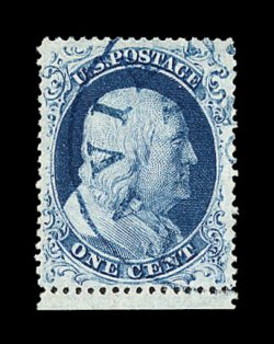 89 O image#22, 1c Blue, Ty. IIIa, outstanding centering within unusually large margins, deep rich color and impression, central strike of rimless grid cancel, extremely fine gem; 1996 PF and 2003 PSE certificates. (Image) 500.00