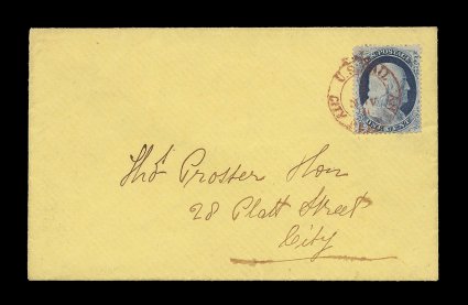 93 c image#23, 1c Blue, Ty. IV, handsome well centered single tied to an immaculate yellow colored drop rate cover by excellent strike of "U.S. Mail/1/Nov 16/City Delivery" red carrier cancel, cover flap with blue circular embossed corner card, stamp with strong rich color, the cover itself is quite fresh (minor mounting stain on reverse), filing staple hole passes through stamp, which is quite tiny and the affected area of the stamp has been so carefully "pushed" back into position that it avoided detection by the certification service, otherwise a very fine and pretty cover bearing a very scarce stamp; clear 2001 PSE certificate. (Image) 980.00+