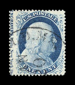 95 O image#24, 1c Blue, Ty. V, gem used single possessing such wide margins (particularly at sides) that a large portion of the engraver's imprint appears in the left margin, outstanding centering, bright color on immaculate paper, light town c.d.s, extremely fine and exceedingly handsome; 2000 PF certificate. (Image) Est. 150-200