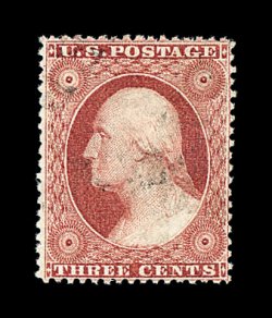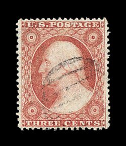 99 O image#26, 3c Dull red, Ty. II, perfectly centered within uncharacteristically wide margins, brilliant color and a clean crisp impression, very light grid postmark, extremely fine; almost impossible to find both in this gem quality and certified; 2001 PSE certificate. (Image) 8.00