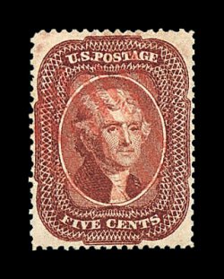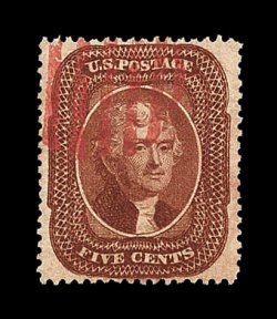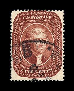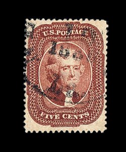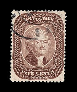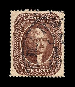 105 O image#28A, 5c Indian red, Ty. I, a marvelous used example of this very rare stamp, being in a quality that would be difficult to improve upon, as it possesses near perfect centering amid unusually wide margins, with its perforations well clearing the design projections all around, and equally impressive is this stamp's remarkably intense and unmistakable Indian red color, plus its impression is richly inked, fully intact and even perforations all around, light New Orleans, La. town c.d.s., an extremely fine gem that is among the very finest used examples available; 1967 PF certificate; ex-Amonette. (Image) 3,250.00