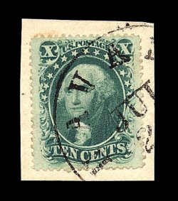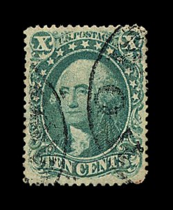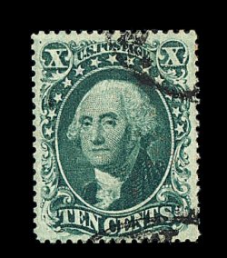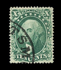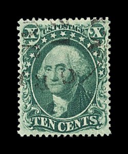 120 O image#35, 10c Green, Ty. V, exceedingly well centered within extra-large margins, deep luxuriant color, neat light strike of a San Francisco c.d.s., extremely fine; 1988 PF certificate; ex-Koppersmith. (Image) 65.00