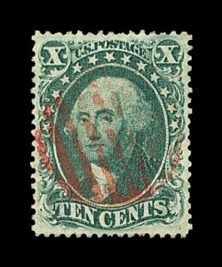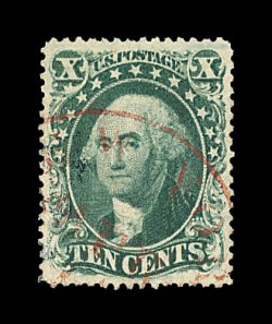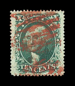 112 O image#33, 10c Green, Ty. III, a magnificent quality used example, being in a condition that simply cannot be improved upon, with mathematically precise centering amid extravagantly large margins, stunning color in a deep rich shade, razor-sharp impression on bright paper, all complemented by a visually striking vivid red grid cancel centrally struck, extremely fine gem; a superb stamp for the finest collection of used classics; 2001 PSE certificate. (Image) 305.00