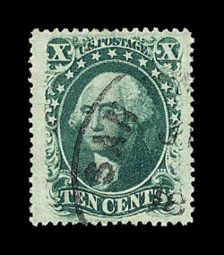 110 O image#31, 10c Green, Ty. I, mathematically precise centering within unusually large margins, rich color and impression, light unobtrusive strikes of a black town c.d.s., extremely fine; an especially scarce stamp so well centered and margined; 1979 PF certificate. (Image) 1,050.00