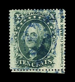121 O image#35, 10c Green, Ty. V, striking used example with immense side margins, so wide in fact that it captures a full engraver's imprint in the right margin, other margins quite large as well, rich shade, blue cancel, extremely fine; a marvelous stamp for the specialist; 2002 PF certificate. (Image) Est. 300-400