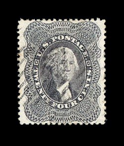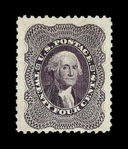 134 og image#45, 24c Blackish violet reprint, without gum as issued, a most remarkable quality example of this reprint rarity, possessing eye-arresting physical attributes, not the least of which is its outstanding centering amid absolutely huge margins for a reprint issue, its color is equally impressive being in an intense shade, while its impression is prooflike on bright fresh paper, fully intact perforations all around, extremely fine gem; arguably the finest example of the Twenty Four Cent 1860 Reprint in existence, of which 479 were issued; 1960 PF certificate; ex-Engel, Klein and Zoellner. (Image) 3,250.00