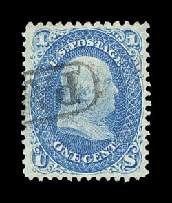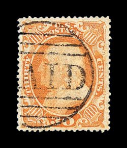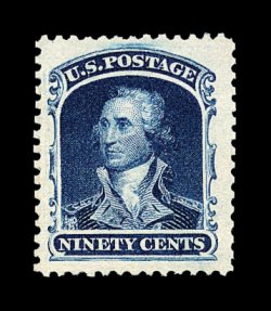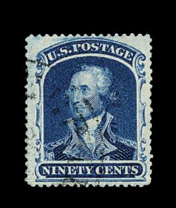 128 O image#39, 90c Blue, a phenomenal used example of this value, which is one of a very few stamps in United States philately that is actually far more rare and valuable in used condition versus mint, with this exciting copy being not only one of a few that is completely sound, but ranks among the very finest in existence, as it is completely free of the myriad of flaws which affect the majority of known used examples, fantastically well centered within exceptionally large margins for this, gloriously rich color in an especially dark shade of blue, with a crisp prooflike impression on bright fresh paper, all marvelously complemented by a neat light strike of a black Philadelphia town c.d.s. (one of the few certified with such a desirable cancel), an extremely fine gem in every regard; an immense condition rarity of extraordinary beauty and eye appeal; according to the Philatelic Foundation records, there are approximately 170 to 180 used examples that have been certified as genuine by their service, and of these only about 25% are sound, of the sound examples only two or three can compare to the overall quality of the stamp offered here; 1980 and 1995 PF certificates; ex-Granzow. (Image) 8,500.00