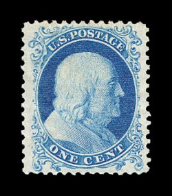 129 og image#40, 1c Bright blue reprint, without gum as issued, fabulously well centered, with large and perfectly balanced margins all around, especially deep luxuriant color and impression on bright crisp paper, an extremely fine gem in every regard; easily one of the most perfectly centered examples of the One Cent Reprint we have ever offered; only 3,846 issued; 1989 PF certificate. (Image) 625.00