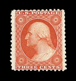 130 og image#41, 3c Scarlet reprint, without gum as issued, virtually perfectly centered top to bottom and side to side, with the side margins being especially wide, radiant color and a prooflike impression on brilliantly white paper, extremely fine; a premium example of this rare reprint, of which only 479 were issued; 1991 PF certificate; ex-"Southern Cross". (Image) 3,250.00