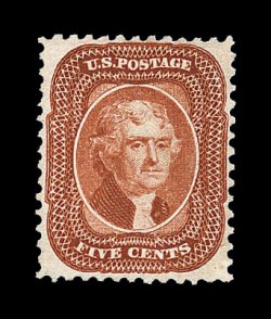 131 og image#42, 5c Orange brown reprint, without gum as issued, incredibly well centered within uncharacteristically large margins, with its perforations well clearing the design all around which is a most uncommon occurrence on this typically poorly centered value, rich luxuriant color and impression which is wonderfully contrasted by its bright paper, fully intact perforations all around, extremely fine; a truly rare and highly desirable stamp in this gem quality; among the finest available of the 878 issued; 1990 PF certificate. (Image) 1,400.00