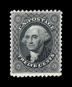 124 O image#36b, 12c Black, plate III, outstanding centering which is almost unheard of on this perpetually difficult value, plus its margins are considerably wider than usually found, even its color is especially intense which is marvelously accented by a light strike of a blue grid, extremely fine; a true condition rarity in this gem quality; 1994 PF certificate. (Image) 205.00