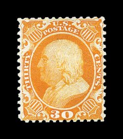 127 O image#38, 30c Orange, a fabulous used example that is, without question, the finest used Thirty Cent Orange 1857 Issue in existence, and may well be the most important condition rarity known from all the values from this series, as each and every aspect of this stamp is truly breathtaking, possessing absolutely perfect centering amid the most immense margins imaginable (both at sides and top and bottom), plus this stamp boasts an overall freshness and crispness which belies its age, as its color is spectacularly rich and radiant, totally unaffected by oxidization as so often found on this value, its impression is unusually strong as well on immaculate paper, a perfectly struck large Boston "Paid" in grid postmark further contributes to this stamp's overall eye appeal, simply superb; this incomparable gem realized a record price ($6,750.00, plus the 10% buyer's premium) in its last appearance in auction in 1999, and we fully expect that it will again attract a similarly lofty realization in the Hinrichs auction; 1992 PF certificate. (Image) 485.00