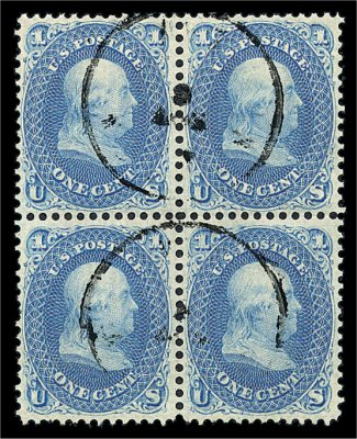 140 Obl image#63c, 1c Blue, vertically laid paper variety, a magnificent quality used block of four of this exceedingly rare and distinctive paper variety, showing clear laid lines, virtually perfect centering throughout the block which would be remarkable for an ordinary block, let alone this desirable variety, prooflike color and impression on bright paper, two light and unobtrusive strikes of an unidentifiable town c.d.s., couple of nibbed perforations in lower left stamp, extremely fine; according to our records there are only three known used blocks found on vertically laid paper, a block of six, another block of four and this block, which is in the finest condition of the three; a highly important multiple for the 1861 specialist and perfect for exhibition; priced only as singles in the Scott catalog; 1993 PF certificate. (Image) 16,000.00+