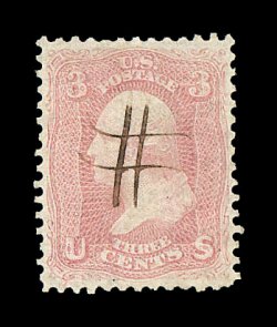 144 O image#64b, 3c Rose pink, unusually large and well balanced margins all around, rich luxuriant color, grid of squares cancel, extremely fine; quite scarce this choice; 2001 PSE certificate. (Image) 150.00