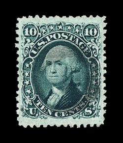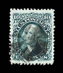 152 O image#68a, 10c Dark green, eye-arresting used example of this shade variety, possessing huge margins and being incredibly well centered within them, intense color in a dark shade, well incised impression on crisp paper, light unobtrusive cancel, an extremely fine large-margined gem; 1987 PF certificate. (Image) 62.50