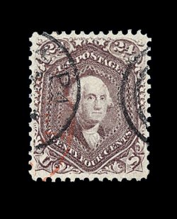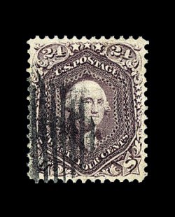 159 O image#70, 24c Red lilac, a truly amazing used example of this always difficult stamp, possessing every physical attribute that is the exact opposite of what is normally encountered, being absolutely perfectly centered amid lavishly large margins, its color is incredibly bright and rich, while its impression is spectacularly detailed on the brightest paper imaginable, all complemented by crisp face-free black and red cancels, superb; a marvelous condition rarity for the finest collection; 1993 PF certificate. (Image) 215.00