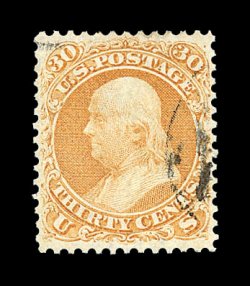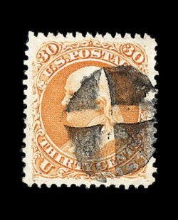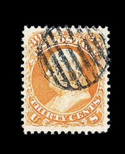 165 O image#71, 30c Orange, absolutely immense margins all around and being perfectly centered within them, gorgeous vibrant color in a deep shade, sharp detailed impression on immaculately white paper, clearly struck quartered cork postmark, superb; a phenomenal gem that is widely regarded as the finest known used example of the Thirty Cent 1861 Issue: footnote in the Scott catalog states "Values for No. 71 are for copies with small margins, especially at sides. Large-margined examples sell for much more."; 1986 PF certificate; ex-Filstrup, Koppersmith. (Image) 160.00