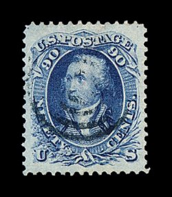 168 O image#72, 90c Blue, a breathtaking used example that possesses the largest margins and most precise centering we have ever seen on this stamp, with enormous perfectly balanced margins all around, bright blue shade and an excellent clarity of impression on fresh paper, light target cancel, a superb jumbo that is clearly among the finest used #72's extant; 1991 PF certificate; ex-Morris. (Image) 425.00