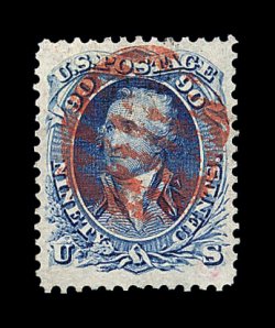 169 O image#72, 90c Blue, outstanding centering amid exceptionally large margins, stunning rich color in a deep shade and a prooflike impression on brilliantly white paper, all strikingly complemented by a bold vivid red grid centrally struck, extremely fine gem; a magnificent quality used example which possesses spectacular eye appeal; 2000 PSE certificate. (Image) 465.00