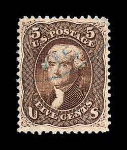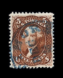 171 O image#75, 5c Red brown, an eye-catching used example of this scarce and difficult stamp, possessing physical characteristics seldom encountered, including being extraordinarily well centered amid huge margins for this issue, and just as impressive is this stamp's spectacularly rich and intense color (unlike any other #75 we have seen), beautifully postmarked with a deep blue town cancel, extremely fine; a remarkable used stamp; 1980 and 1995 PF certificates. (Image) 485.00