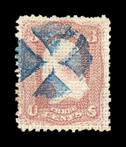 179 O image#79, 3c Rose, "A" grill, an unusually choice used example of this notoriously difficult stamp, being exceptionally well centered within unusually large margins, rich luxuriant color and impression, crisp strike of attractive blue quartered cork cancel, even its perforations are much more intact than typically encountered, very fine; one of the few premium used examples of the Three Cent "A" Grill we have offered; 1994 PF certificate. (Image) 1,425.00