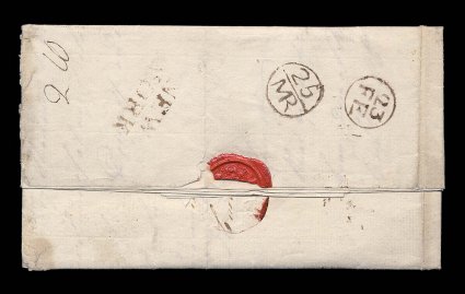1001 c image"NEW/YORK" two-line handstamp on back of 1767 folded letter to London, "24/FE" in circle and "25/MR" bishop's receiving mark, fine; a scarce early New York City marking. (Image) ASCC $1,000.00