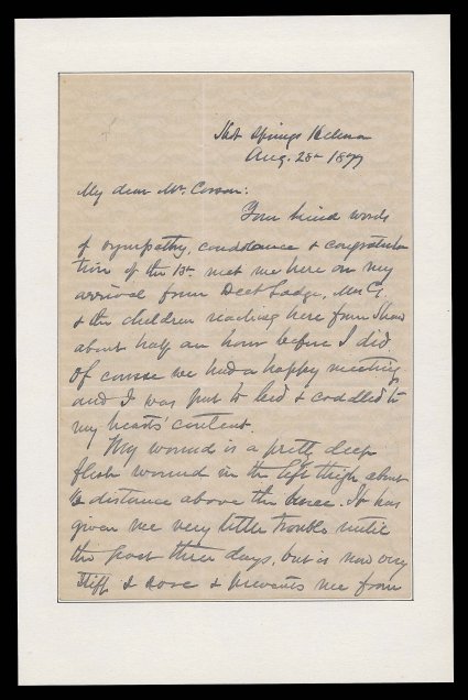 1002 imageGeneral John Gibbon, three-page ALS ("John Gibbon") datelined Hot Springs Helena (Montana Terr.) Aug. 28th, 1879, letter talks about his arrival from Deer Lodge, describes his wounds at the battle of Big Hole and reflects on Nez Perces escape; General Gibbon was in command at the battle of Big Hole, and was also a distinguished Civil War commander, was at Grant's side when Lee surrendered and was part of Lincoln's honor guard when the Gettysburg address was delivered, the letter has been neatly affixed to a backing, very fine and interesting. (Image) Est. 300-400