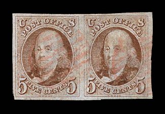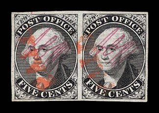 1004 O 9X1 image#9X1, New York, N.Y. 5c Black Postmaster Provisional, signed ACM connected, horizontal pair, positions 32-33, large even margins all around, remarkably fresh, with a razor-sharp impression on clean paper, red "Paid" cancels, extremely fine; any used pair of this stamp is scarce, but to find one in this gem quality and cancelled solely by a "Paid" and without the usual blue ink manuscript cancel is quite rare and extremely desirable; 2002 PF certificate. (Image) $1,350.00