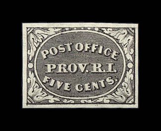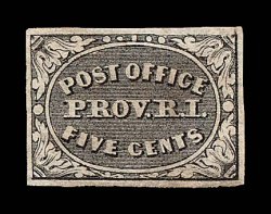 1006 og 10X1 image#10X1, Providence, R.I. 5c Gray black Postmaster Provisional, an unusually fresh mint single with wide even margins all around, sharp detailed impression, full o.g., lightly hinged, extremely fine; 1985 PF certificate. (Image) 350.00