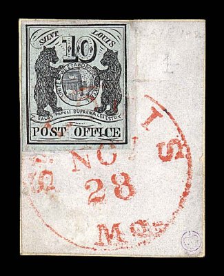 1007 O 11X2 image#11X2, St. Louis, Mo. 10c Black on greenish wove Postmaster Provisional, type I, position 2, an especially handsome and rarely seen sound example tied to large piece solely by a nicely struck "St. Louis, Mo./Nov 28" red c.d.s., without the usual pen cancel typically used on these issues, stamp is exceptionally bright and fresh, with three very large margins, fourth at top close but clear, stamp has been lifted for examination and hinged neatly back in place, very fine and desirable; 2004 PF certificate; ex-Hessel, Waterhouse. (Image) 5,000.00