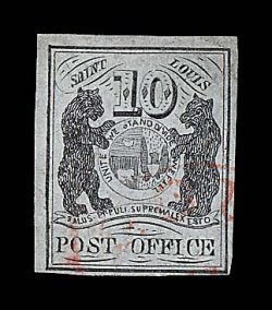 1008 O 11X5 image#11X5, St. Louis, Mo. 10c Black on gray lilac Postmaster Provisional, type III, an extremely rare sound used example of this value, possessing an uncommon overall freshness not typically associated with the St. Louis Bear issues, four well clear to large margins, strong impression, lightly cancelled by a red St. Louis, Mo. town c.d.s. and without the usual pen cancellation, very fine and choice; one of the few recorded examples of Scott #11X5 that is not only sound, but cancelled solely by a town c.d.s. as well; 2000 PSE and 2002 PF certificates. (Image) 4,000.00