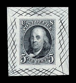 1009 T 1TC image#1TC, 5c Black, large die trial color proof on white bond, an uncommonly choice example of this scarce and handsome proof, shows a large even portion of the crosshatching on all sides measuring 31x34mm, highly detailed impression in this popular and desirable color, marvelously fresh, extremely fine. (Image) 800.00