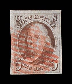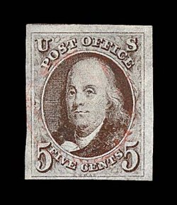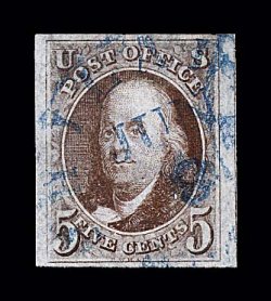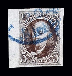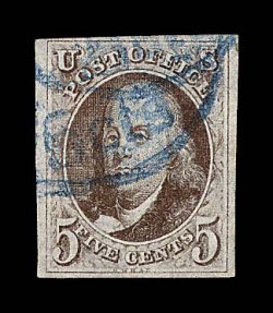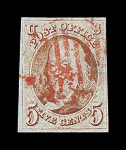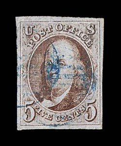 1019 O 1a image#1a, 5c Dark brown, a breathtakingly beautiful used example, possessing huge margins all around including a sizable sheet margin at left measuring almost 5mm, plus a portion of the adjoining stamp appears at top, gloriously rich color and a truly prooflike impression on paper which still retains its original bluing, neatly cancelled by a blue Philadelphia, Pa. "10 cts" integral rate postmark, a superb gem representing the finest attainable quality for the early Dark Brown color; 2000 PF certificate; ex-Haas and Wall. (Image) $660.00