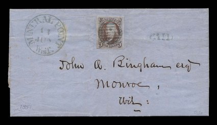 1018 c 1 image#1, 5c Red brown, very large margins all around, especially rich color, wonderfully postmarked on an 1851 folded letter to Monroe, Wis. by bold central strike of a greenish blue grid, with matching "Paid" to right and superb "Mineral Point, WisT./11 Jun" c.d.s. to left, a post-territorial use of an old territorial designation, couple of trivial bleached spots in lettersheet, stamp has been lifted for examination and hinged in place, overall an extremely fine and lovely cover; a desirable and rare Five Cent 1847 usage from Wisconsin, with only eight Five Cent recorded usages from Mineral Point in the Alexander census; 1993 and 1998 PF certificates; ex-"Sevenoaks" collection. (Image) Est. 3,000-4,000
