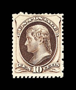 1285 og 172 image#172, 10c Pale brown special printing, without gum as issued, an unusually attractive and fresh example of this extremely rare and terribly challenging stamp, being among the very few existing copies that, though scissors separated, has intact perforations all around, centered a bit to the top but well clear and better than typically seen, rich characteristic color and a crisp detailed impression, very fine and choice; it is believed that no more than 40 examples of this value exist; signed E. Stern and accompanied by 1945 APS and 1991 PF certificates; ex-Col. Green, "Southern Cross". (Image) $14,500.00