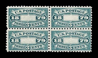 1282 og 169 image#169, 3c Blue green special printing, without gum as issued, an unusally handsome example of this immensely rare stamp of which no more than 40 are believed to exist, this particular copy with perforations clear of the design all around and, though centered a bit to the right, this copy is one of the better centered of this small population, fresh and bright, with sumptuously rich color and impression, scissors separated as virtually always, but retaining nearly all of its perforations except for a few at left, a very fine and a choice example of a stamp that is missing in even the most advanced collections; 1953 APS, and 1961 and 2000 PF certificates; ex-Lyons. (Image) $15,000.00