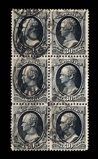 1310 O 190 image#190, 30c Full black, used block of six (2x3), centering ranges from fine on the bottom stamps to an extremely fine gem on the middle right stamp, strong color and impression, oval cancels, a few hinge reinforced perfs. at top and bottom, corner perf. thin at bottom right, overall a very fine multiple. (Image) $555.00+