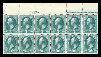 1322 nhPB 207 image#207, 3c Blue green, full top margin imprint and plate "No. 396" block of twelve, wonderfully fresh, top row is especially well centered, o.g., never hinged, very fine; a most attractive example of this exceedingly scarce Bank Note plate block. (Image) for hinged $1,870.00+