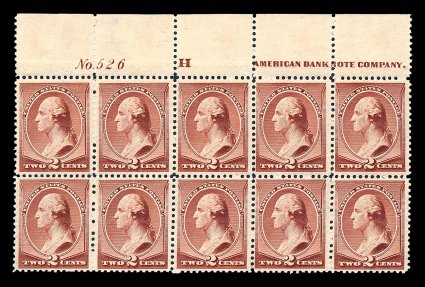 1330 ogPB 210 image#210, 2c Red brown, full top margin imprint, letter "H" and plate "No. 526" block of ten, nicely centered, strong rich color, full o.g., lightly hinged, a couple reinforced perfs. at left, a very fine and attractive plate block. (Image) $1,100.00