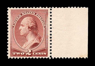 1334 og 211B image#211B, 2c Pale red brown special printing, right sheet-margin example that is wonderfully well centered, with large margins all around, deep luxuriant color and impression on fresh paper, full clean o.g., barest trace of hinging (if at all), extremely fine; photocopy of a 1984 PF certificate for a block of four, this being the top right stamp, plus a 1985 PF certificate as a single. (Image) $450.00