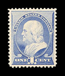 1337 nh 212 image#212, 1c Ultramarine, a breathtaking top right corner sheet-margin mint example in the finest attainable quality, possessing essentially perfect centering amid enormously large margins, wonderfully fresh and bright color on immaculate paper, pristine o.g., never hinged, extremely fine; an incomparable gem for the finest collection; 2004 PF certificate. (Image) 290.00