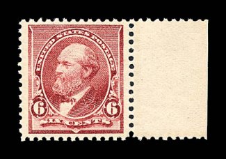 1361 nh 224 image#224, 6c Brown red, immaculate right sheet-margin single, possessing extraordinarily large margins all around and being perfectly centered within them, strong rich color and impression on bright paper, o.g., n.h., an extremely fine gem for the perfectionist; 1991 PF certificate for a strip of four from which this stamp was taken; ex-Floyd. (Image) 210.00