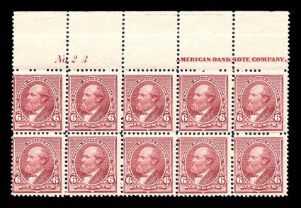 1363 nhPB 224 image#224, 6c Brown red, full top margin imprint and plate "No. 23" block of six, rich fresh color, fresh clean o.g., never hinged, a few minor perf. separations in the top selvage, fine; a desirable example of this rare plate block. (Image) $4,500.00