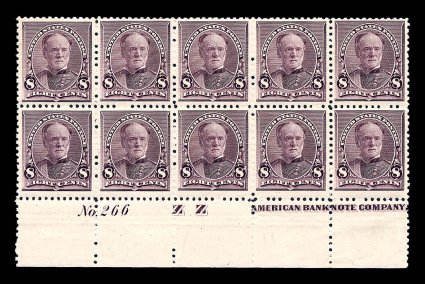 1366 nhPB 225 image#225, 8c Lilac, full bottom margin imprint, "ZZ" and plate "No. 266" block of ten, unusually fresh and crisp, well centered, clean o.g., never hinged, light crease at top left, otherwise very fine and handsome. (Image) $3,150.00